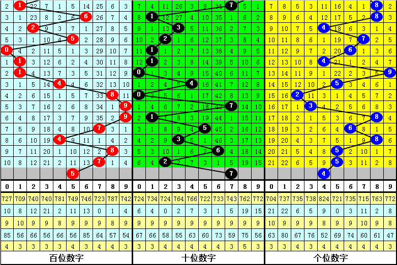 百位号码:前50期走势活跃的号码为:1开出8个,0、9开出7个;走势最冷的号码为:2、3开出2个,5、8开出4个。奖号012路比开出21:19:10,奇偶比开出26:24。本期百位杀排除:1、4,注意号码5、6、8,胆码参考5。