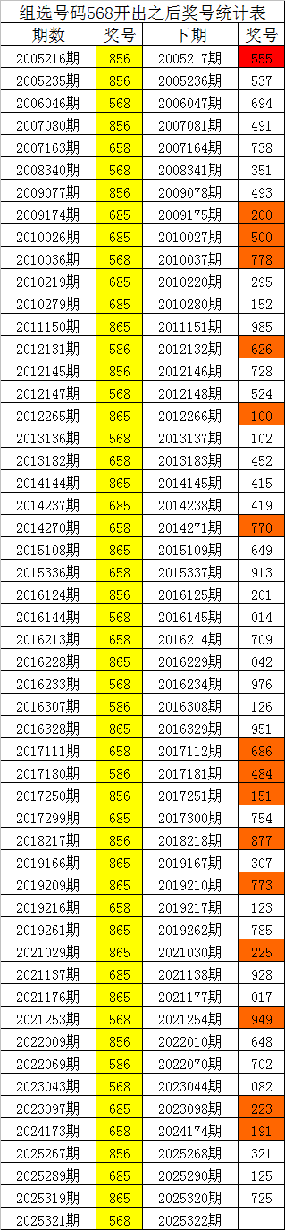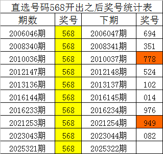 从上表统计可以看出,直选号码568开出之后,其下期奖号: