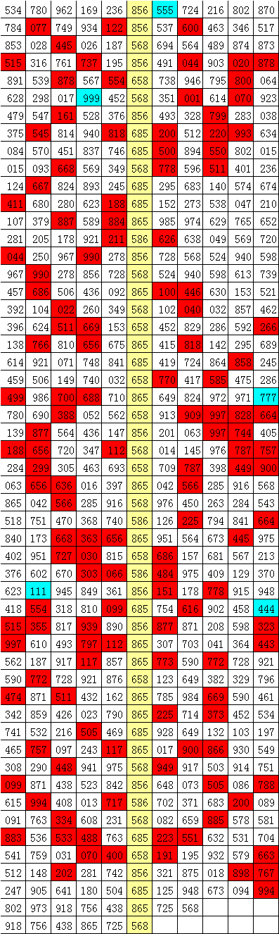 在以上统计表中,组选号码568开出之后,其下期豹子号码出现1次,组三号码出现15次,组六号码出现36次。其中,下期奖号有21期无重号,有31期开出重号,本期排除重号,看好开出组六号码。