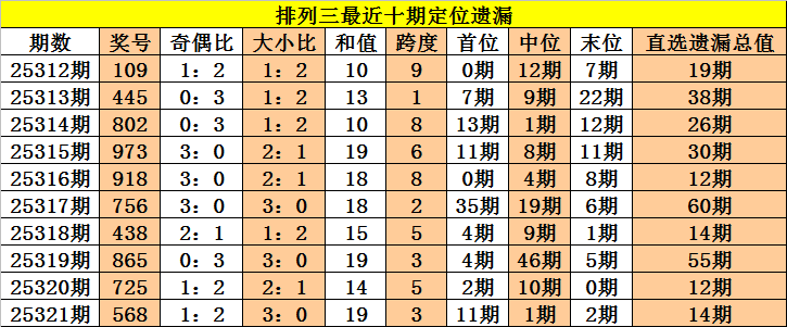 开奖回顾:排列三第2025321期奖号:568,定位直选遗漏值11期、1期、2期,遗漏总值为14期。