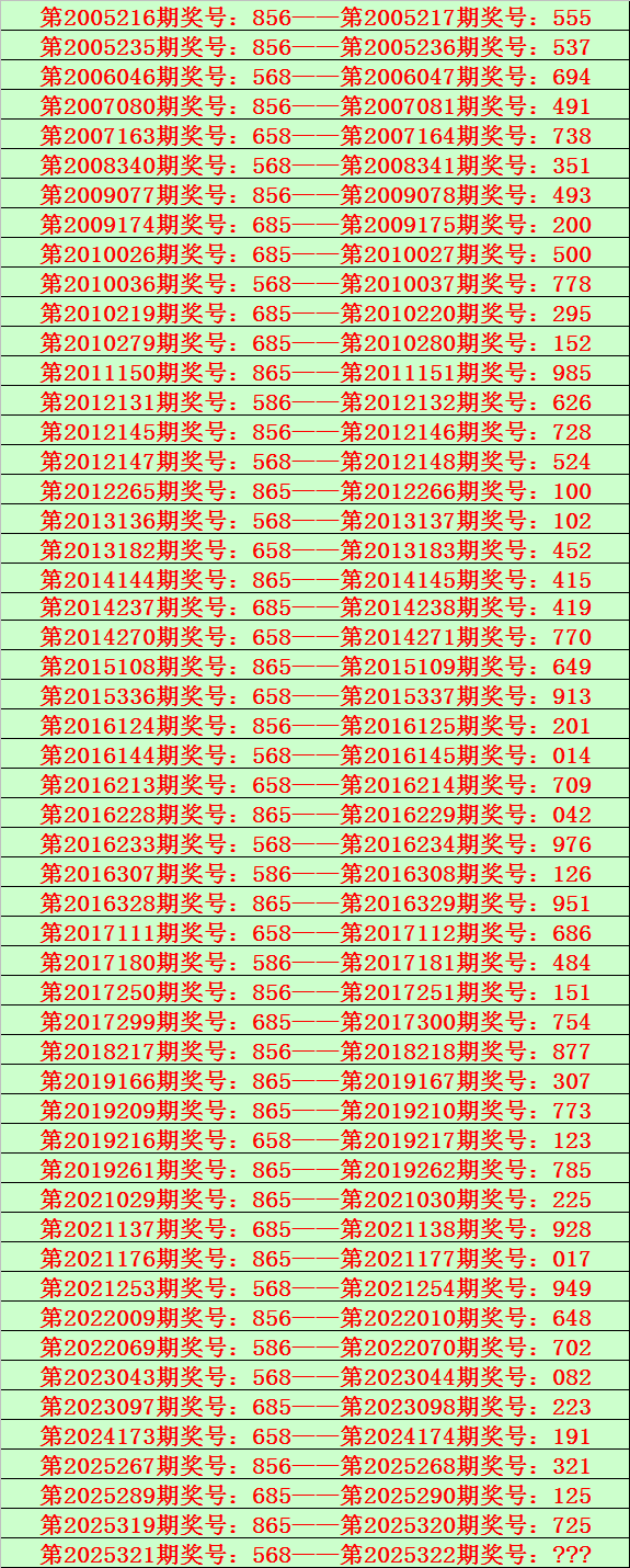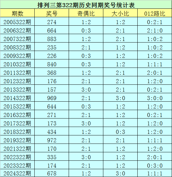 排列三第2025322期开奖日期:2025年12月2日,历史上第322期已开出了19次奖号,历年同期号码分别为:274、664、883、235、226、840、368、176、157、969、644、271、173、434、972、170、335、174、678。