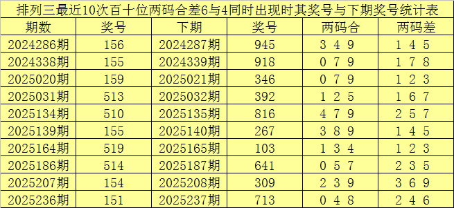 百十位合差分析:上期奖号百十位开出51组合,两码合为6,两码差为4,最近10次百十位两码合6与两码差4同时出现时,其奖号和下期奖号分别为: