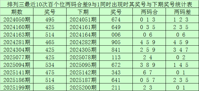 百个位合差分析:上期奖号百个位开出54组合,两码合为9,两码差为1,最近10次百个位两码合9与两码差1同时出现时,其奖号和下期奖号分别为: