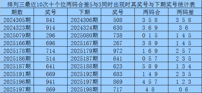 从以上统计可以看出,十个位两码合差5与3同时出现之后其下期两码合差表现最热的4个分别为:1345,本期十个位两码合差可以参考这四码中的数据。