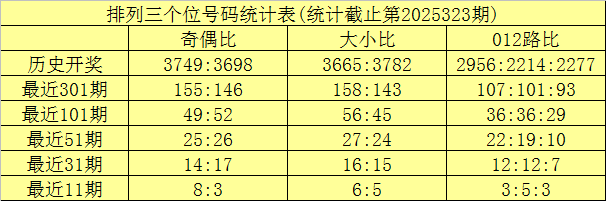 在连续11期奖号中,该位奇偶比为4:7,奇数出现较少,本期适当关注奇数回补;