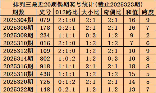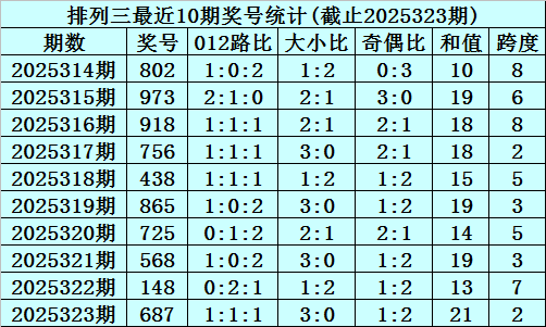 上期回顾:排列三2025323期奖号为687,奇偶比为1:2,大小比为3:0,跨度为21。