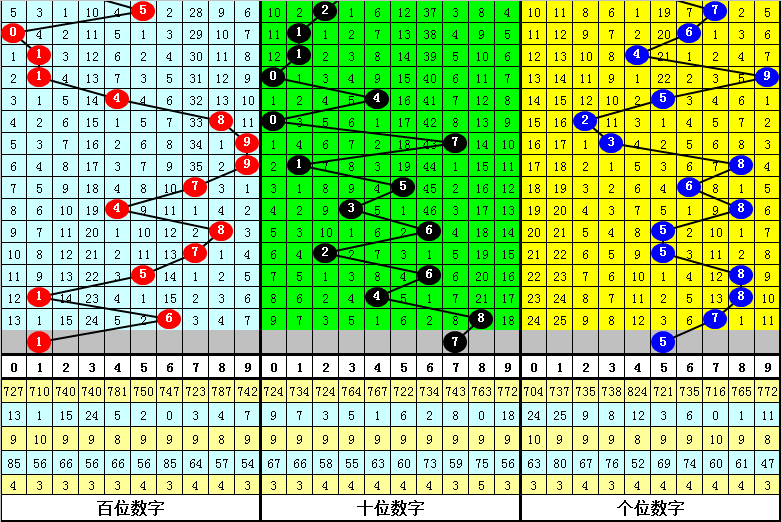 十个位合推荐:最近三期十个位合分别出现4-2-5,本期预计十个位合开出0路号,两码关注57。