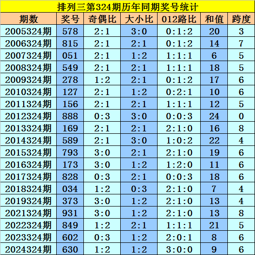 本期为排列三第2025324期开奖,历史上排列三第324期已开出了19期奖号了:
