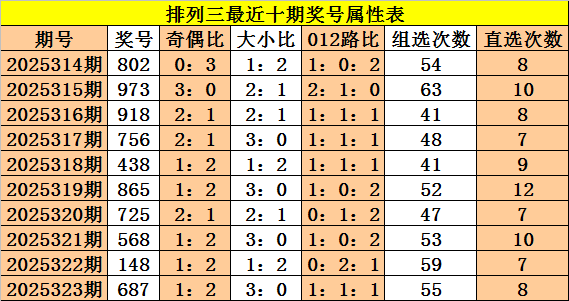 上期回顾:体彩排列三第2025323期奖号:687,奇偶比1:2,大小比3:0,012比1:1:1。