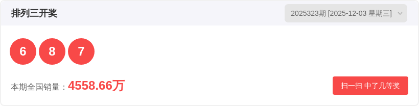 排列325323期开奖结果6 8 7,和值尾1,豹子/组三/组六为组六,和值21,大小比3:0。