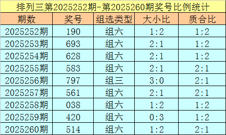 上期回顾:排列三第2025260奖号开出514,奖号质合比为2:1,大小比为1:2,跨度为4,类型为组六。