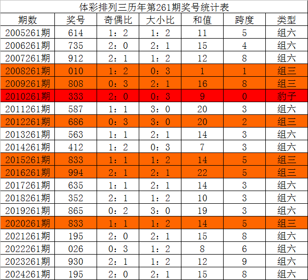 体彩排列三历年第261期开出奖号分别为:614、735、912、010、808、333、587、686、563、412、833、994、635、352、865、833、195、026、930、195。统计详见下表: