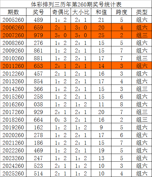 在历年排列三第261期开奖中:号码大小比为30:30,大小 号码出现比例基本相当,本期看好大号热出,大小比关注2:1。