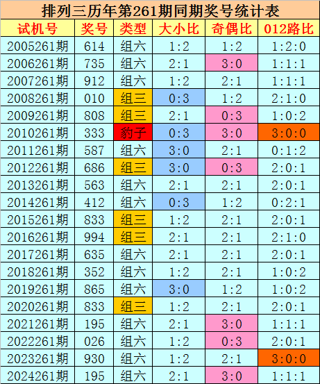 组选类型推荐:历史上排列三第261期同期奖号中,组六出现13期,组三出现6次,豹子出现1期,今年第261期预计奖号为组六号码。