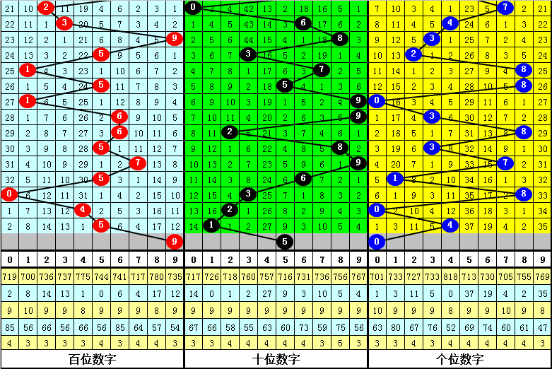 号码个数分析:历史上排列三第261期同期奖号中,号码0-9出现个数分别为:号码7开出2个,号码4开出3个,号码2开出4个,号码0开出5个,号码1、9开出6个,号码6、8开出7个,号码5开出8个,号码3开出12个,今年第261期排除号码2。