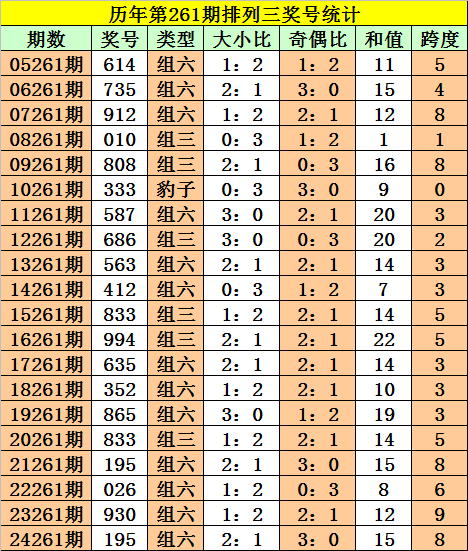 历年第261期排列三奖号:614 - 735 - 912 - 010 - 808 - 333 - 587 - 686 - 563 - 412 - 833 - 994 - 635 - 352 - 865 - 833 - 195 - 026 - 930 - 195。