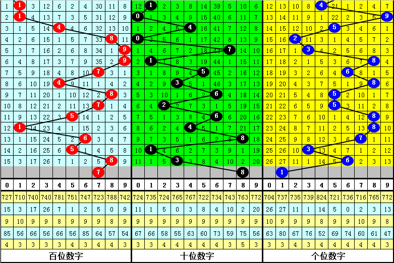 在百位前9次出现号码8之后,下期百位分别开出奖号:1-7-5-3-0-7-5-9-7,其中开出号码个数奇偶比是8:1,大小比是6:3,012路比是3:4:2。