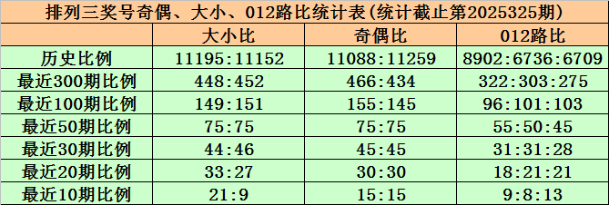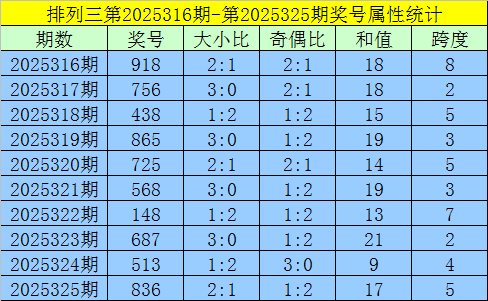 上期回顾:排列三第2025325期出现奖号836。开出组六,奇偶比1:2,012路比2:0:1,大小比2:1,和值17,跨度5。