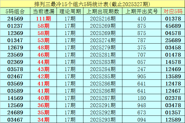 (5)排列三目前遗漏值最大的5码组六组合为:24569,本期遗漏111期,短期解冻的可能性较小,则25328期奖号分布在24569-01378之中的可能性最大。