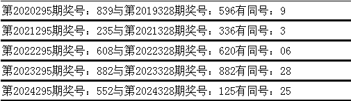 与前期历史同期奖号对比分析,在最近五年开奖中,第295期同期奖号与第328期同期奖号都出现了相同号码: