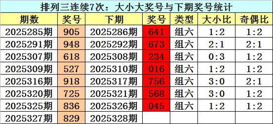 上期回顾:排列三2025327期奖号为:829。类型:组六,奇偶:偶偶奇,大小:大小大。