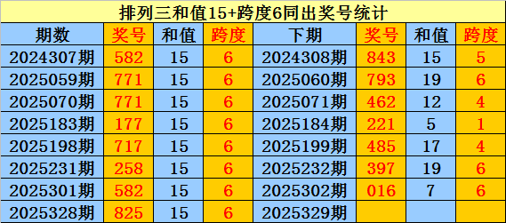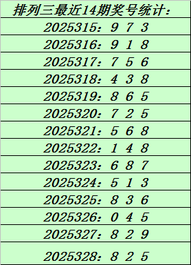 上期回顾:排列三第2025328期奖号:825。和值15,跨度6。