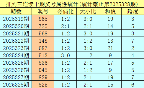 上期回顾:排列三第2025328期奖号:825。类型:组六,奇偶形态:偶偶奇,大小形态:大小大,和值:15,跨度:6。