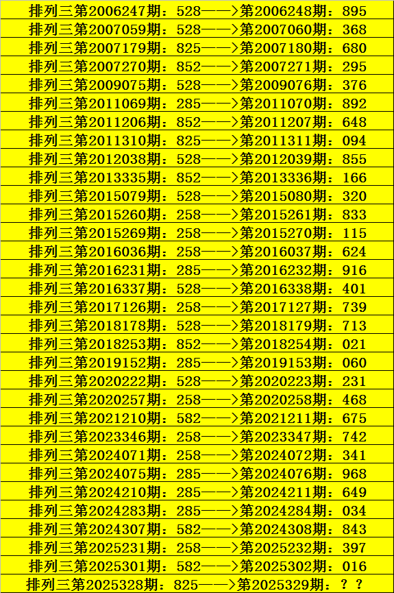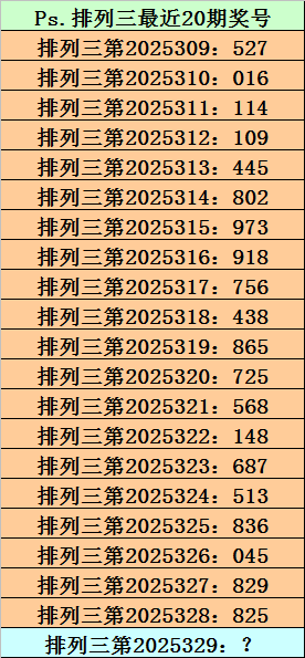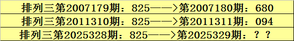 第2025328期排列三奖号为825,历史上该号码直选出现3次,下期奖号分别为:680、094。