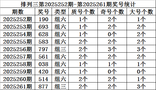 上期回顾:排列三第2025261期开奖:877,质合比为2:1,奇偶比为3:0,大小比为2:1。
