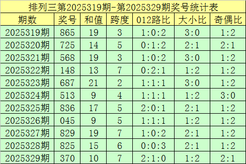 开奖回顾:排列三第2025329期奖号开出:370,组选类型:组六,大小比为1:2,奇偶比为2:1,和值为10,跨度为7。
