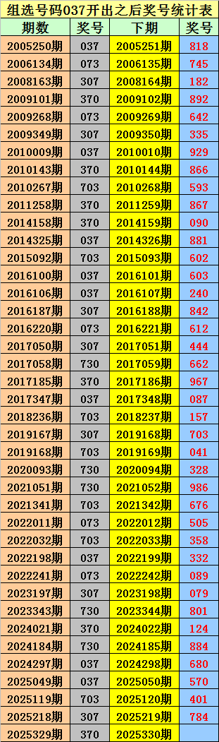 排列三组选037出现之后下期分别开出:818、745、182、892、642、335、929、866、593、867、090、881、602、603、240、842、612、444、662、967、087、157、703、041、328、986、676、505、358、332、089、079、801、124、884、680、570、401、784。