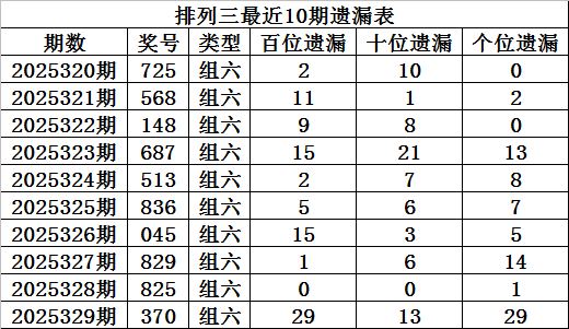 上期回顾:排列三第2025329期奖号:370,组六,直选遗漏总值为71期。