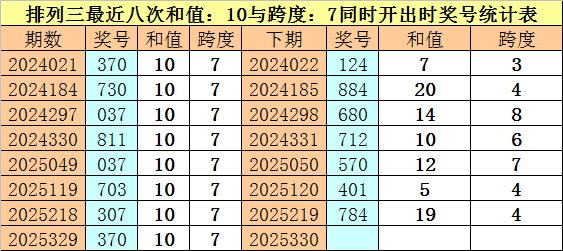 开奖回顾:体彩排列三第2025329期奖号为:370。和值为:10,跨度为:7。
