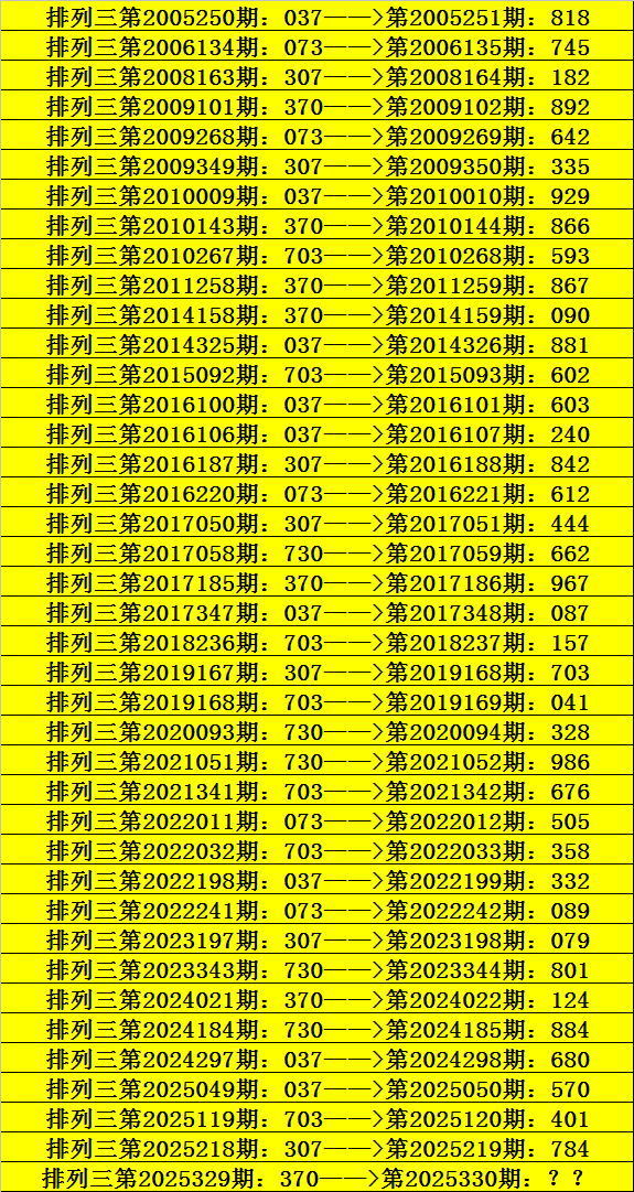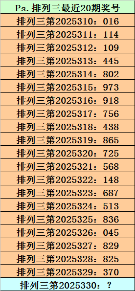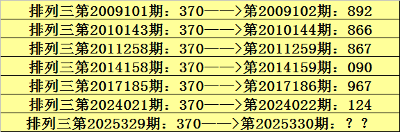 第2025329期排列三奖号为370,历史上该号码直选出现7次,下期奖号分别为:892、866、867、090、967、124。