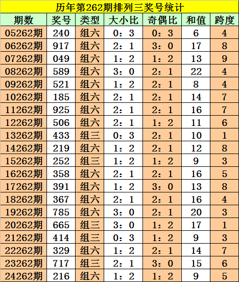 历年第262期奖号中:组三开出5次,组六开出15次。组三较少,本期注意组三反弹。