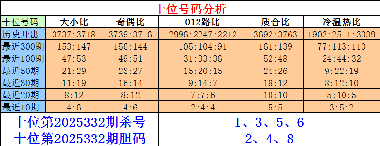 近期个位质数号码走冷,目前轮空3期,本期注意质数号码出现;近期该位大号走势较冷,目前轮空3期,本期重点关注大号解冻。个位杀号:2346,胆码关注:058。