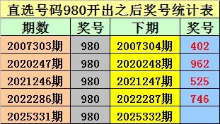 排列三直选980出现之后下期奖号分别为:402-962-525-746。