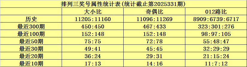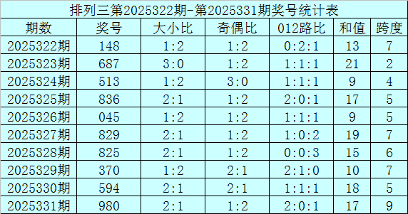 上期回顾:排列三第2025331期奖号为980,奖号012路比为2:0:1,奇偶比为1:2,大小比为2:1,和值为17,跨度为9。