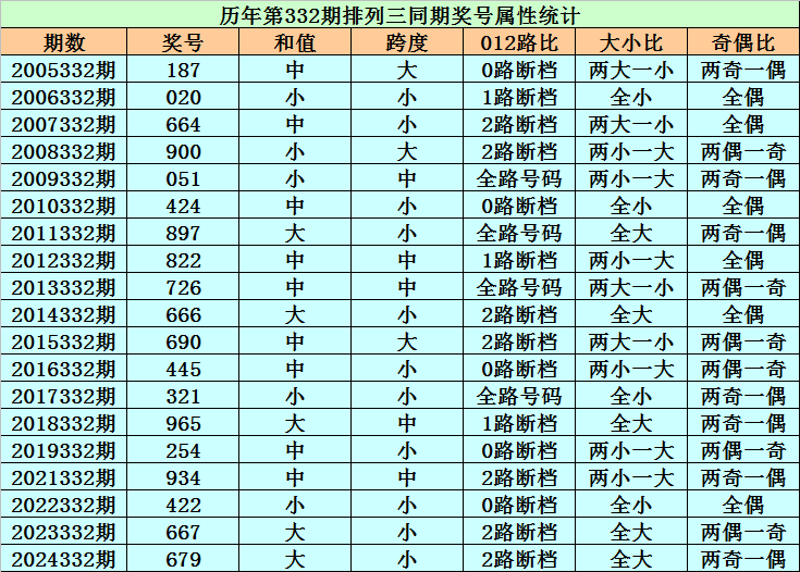 历史上第2025332期排列三已开出19期奖号了,历年同期奖号分别为:187、020、664、900、051、424、897、822、726、666、690、445、321、965、254、934、422、667、679,详细统计见下表: