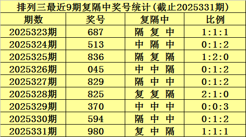 上期回顾:排列三第2025331期奖号为:980。大小比为2:1,奇偶比为1:2,012路比为2:0:1。