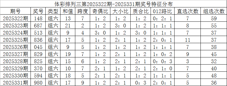 开奖公告:体彩排列三第2025331期开出奖号:980。组六,有重号:9,奇偶比1:2,大小比2:1,012比2:0:1,和值17,跨度9。