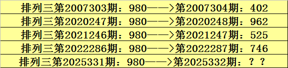 第2025331期排列三奖号为980,历史上该号码直选出现5次,下期奖号分别为:402、962、525、746。