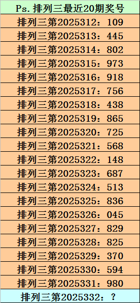 第2025331期排列三奖号为980,历史上该号码组选开出36次,下期奖号分别为:900、772、517、402、803、784、319、545、631、932、572、733、822、424、430、472、323、806、321、951、503、856、170、854、764、962、160、901、525、761、818、474、746、915、341。