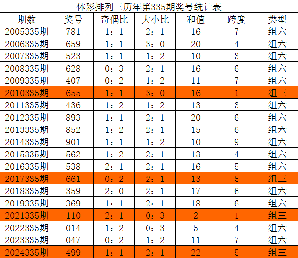 体彩排列三历年第335期开出奖号分别为:781、659、523、628、407、655、436、893、852、901、562、538、661、359、369、110、014、047、499。统计详见下表: