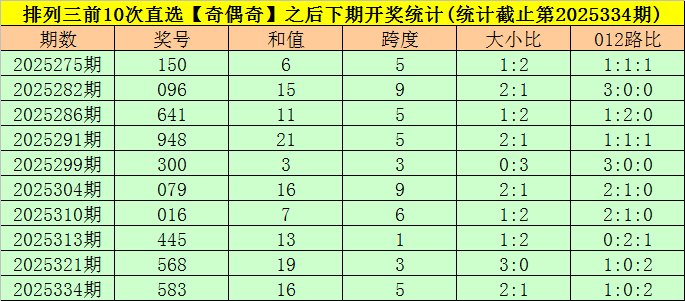 开奖回顾:排列三第2025334期开出奖号:583,类型为组六,和值为16,奇偶比为2:1,大小比为2:1,跨度为5。