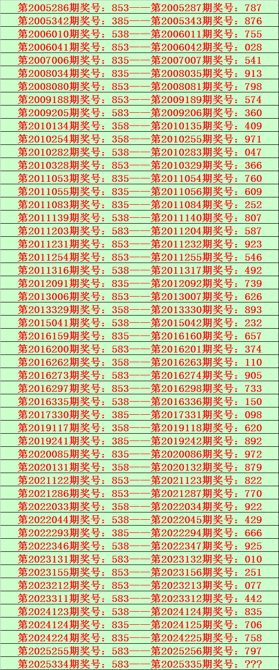 排列三第2025334期开出奖号583,该号码历史上组选出现51次,前50次开出之后期下期奖号为:787、876、755、028、541、913、798、574、360、409、971、047、366、760、609、252、807、587、923、546、492、739、626、893、232、657、374、110、905、733、150、098、620、892、972、879、822、770、922、429、666、925、010、251、077、442、835、706、758、797,详见下表: