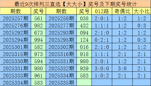 1.排列三第2025334期奖号开出583,大小直选分布为:大大小,在历史开奖中直选【大大小】分布已开出911期,在前9次直选【大大小】分布中,出现奖号为:561-982-673-994-582-973-594-980-961,组三开出1期,组六开出8期。
