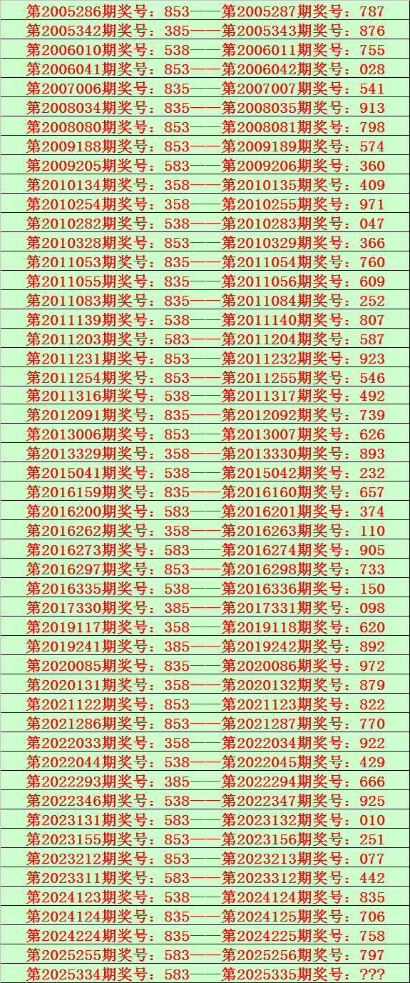 排列三第2025335期开奖日期:2025年12月15日,历史上第335期已开出了19次奖号,历年同期号码分别为:781、659、523、628、407、655、436、893、852、901、562、538、661、359、369、110、014、047、499。