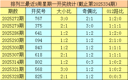 三、体彩排列三前9周星期一奖号分别开出:767-375-641-094-843-618-802-568-825,其中号码012路比为9:8:10,奇偶比为11:16,大小比为16:11;
