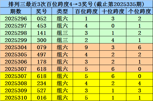 第2025304-第2025306期奖号:079、497、178,其下期奖号为:618,首位号码跨度为5;